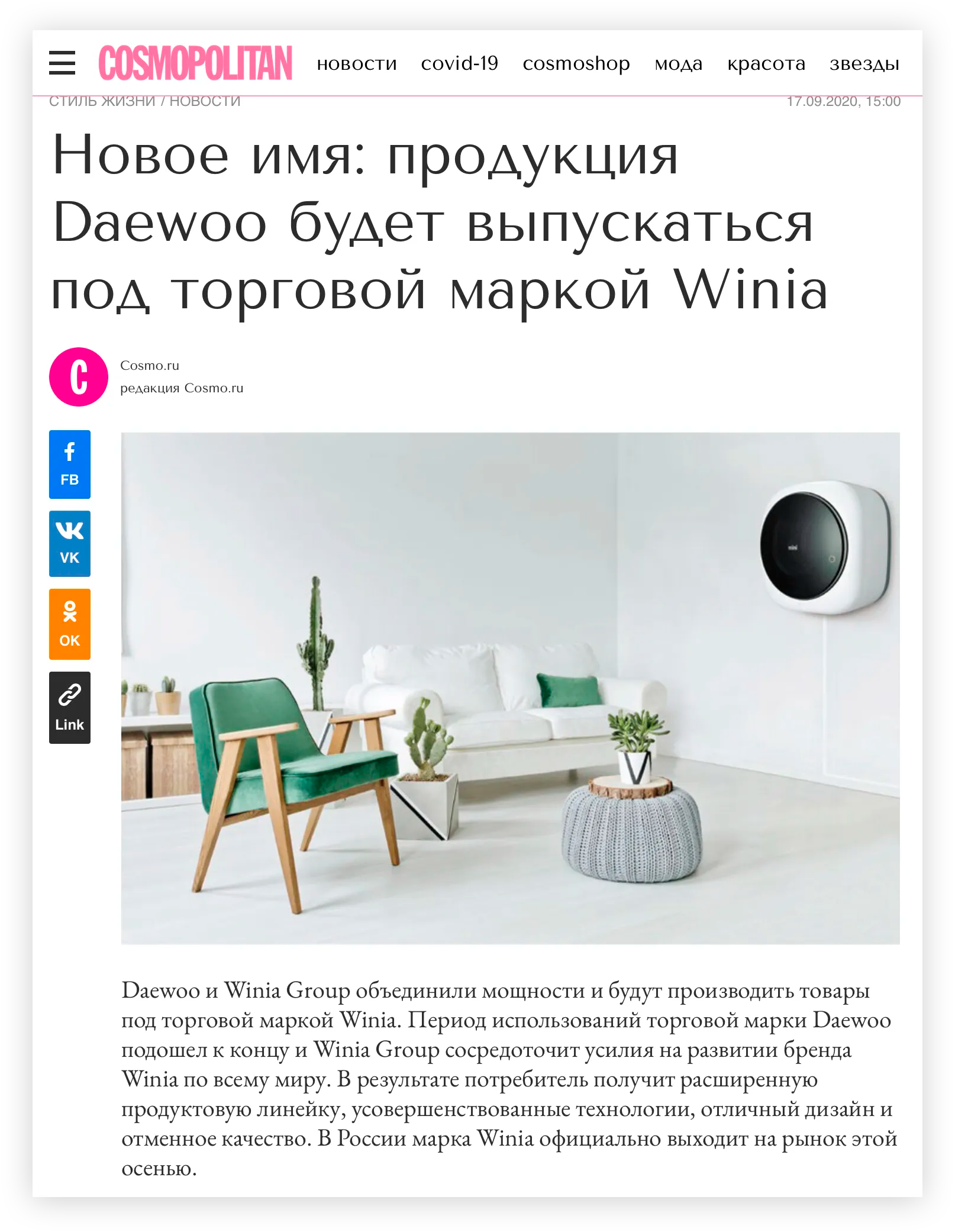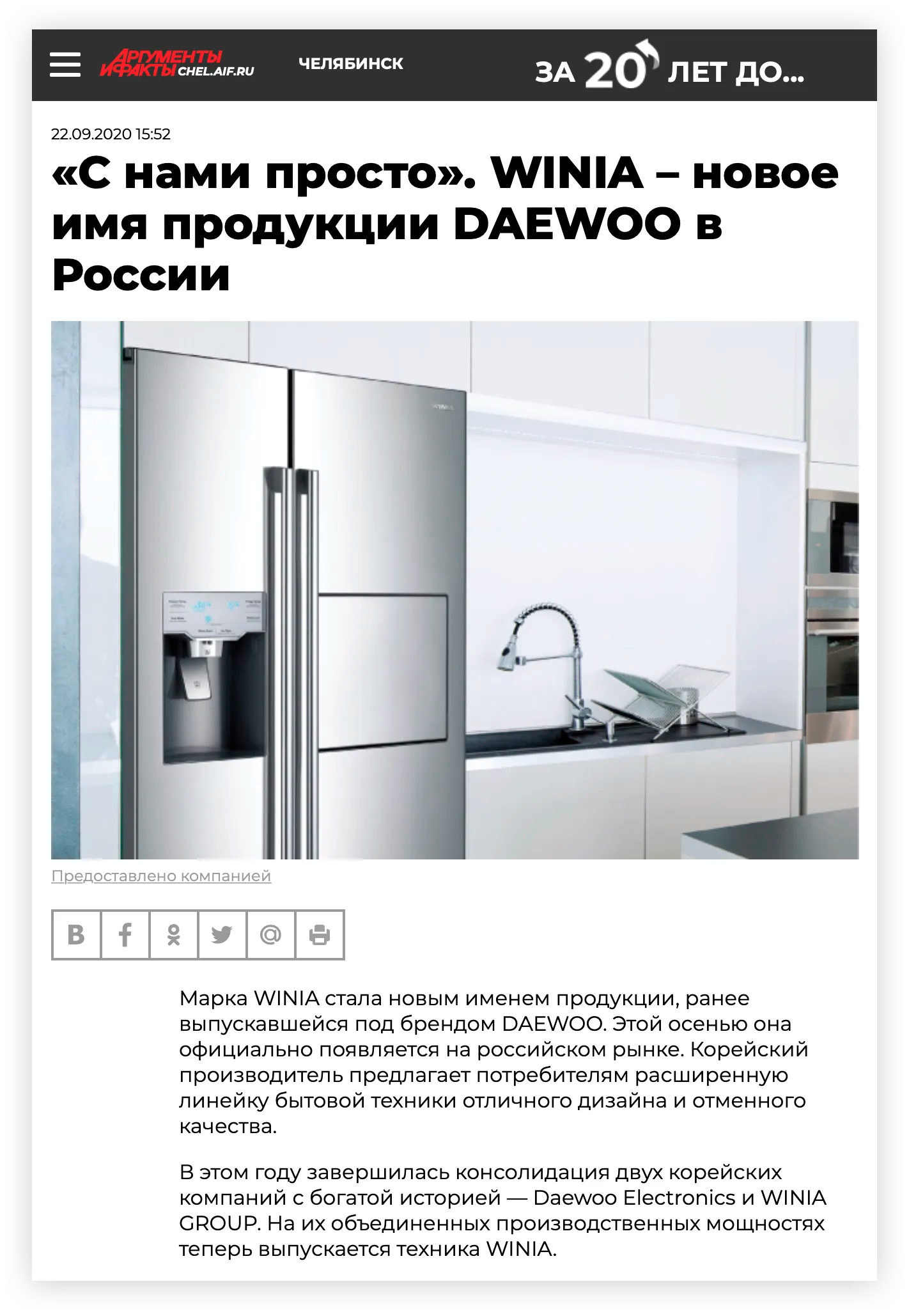 В 2020 году Daewoo провёл ребрендинг и стал WINIA. Мы помогли бренду перестроиться в соцсетях. Вместо привычных рекламных постов мы сделали акцент на сторителлинг и вовлечённость: