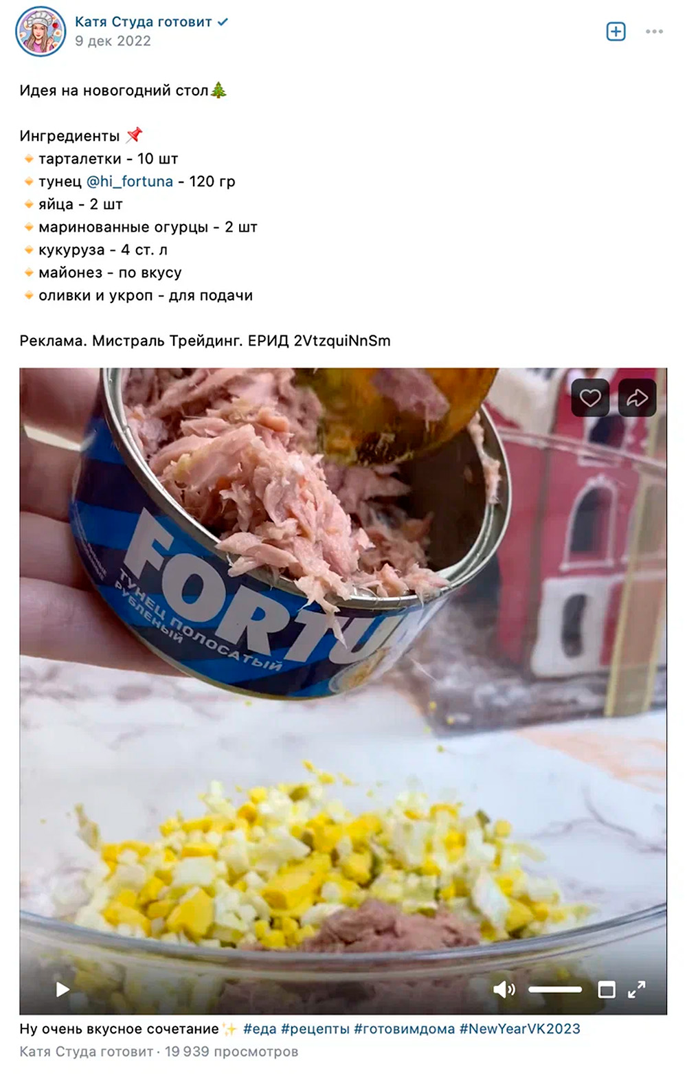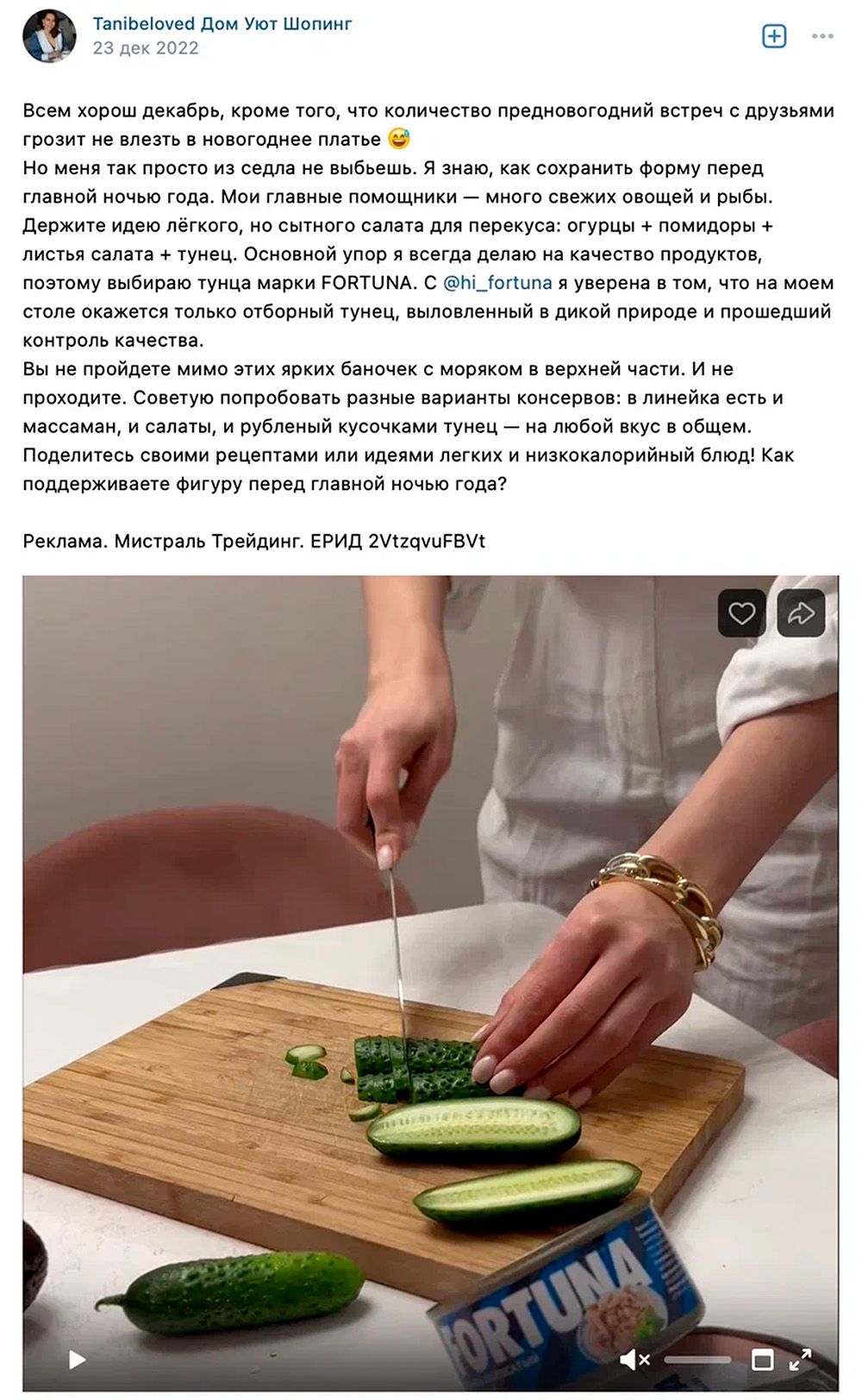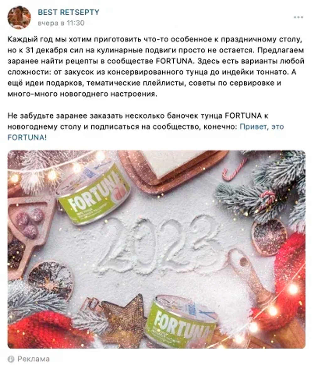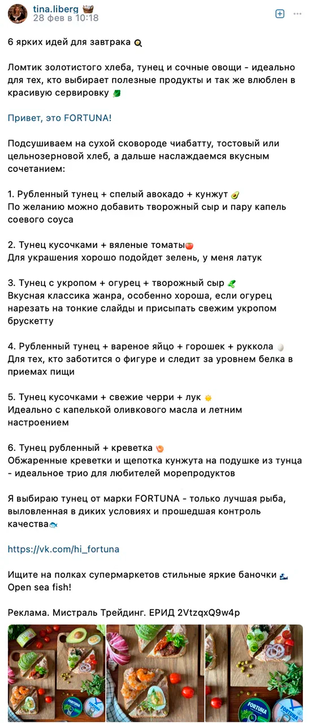 Бренд хотел сотрудничать с небольшими бартерными блогерами с охватами 50–100 тысяч человек и нативно встраивать FORTUNA в рецепты или лайфстайл. Помимо этого мы рекомендовали: