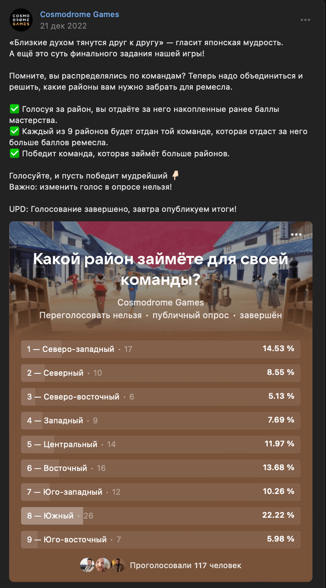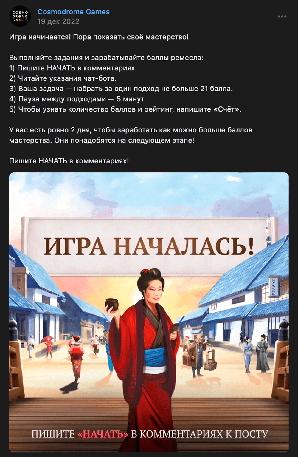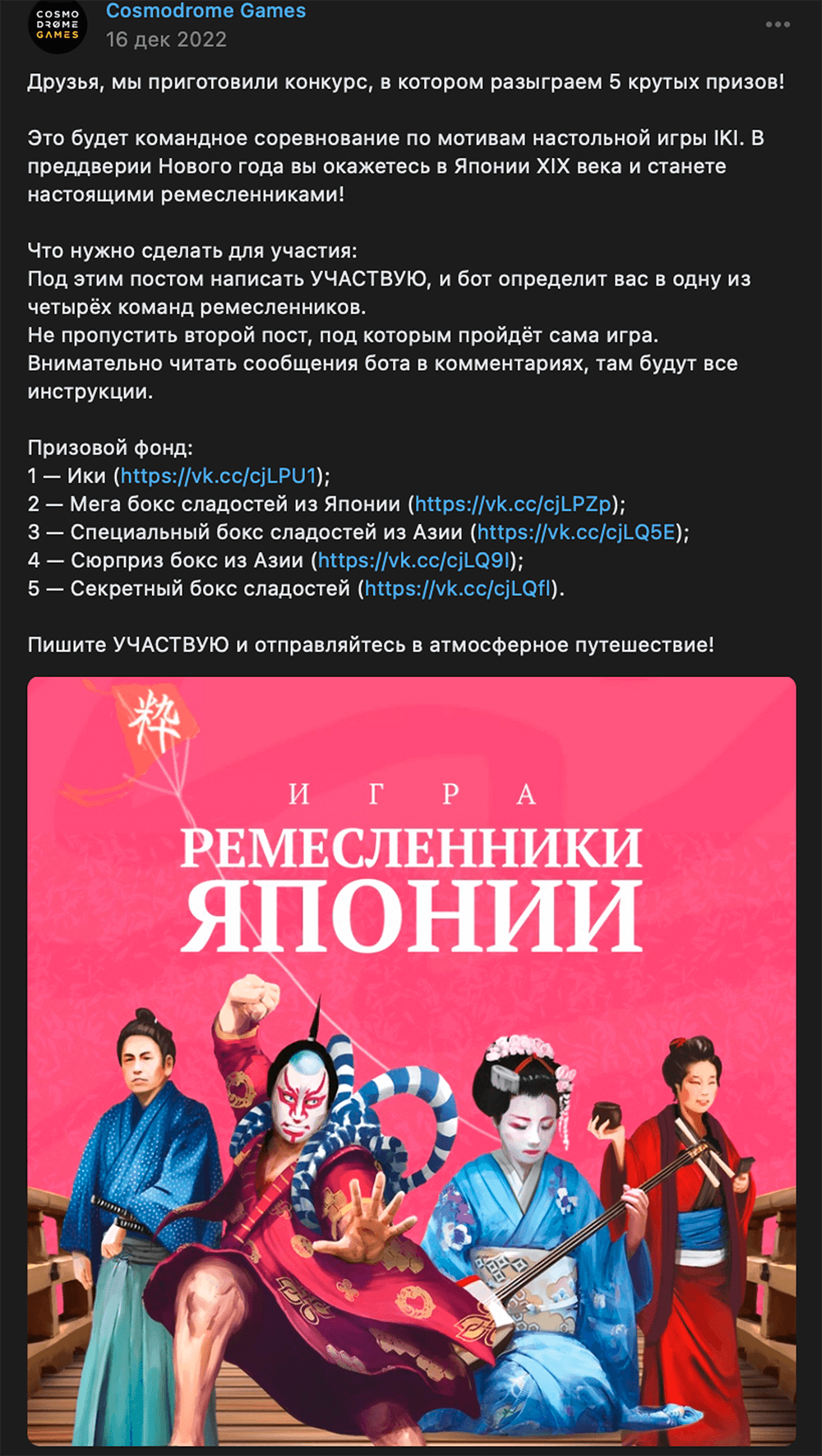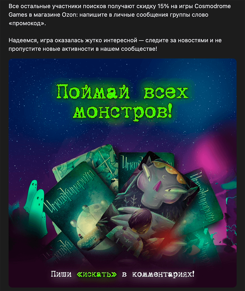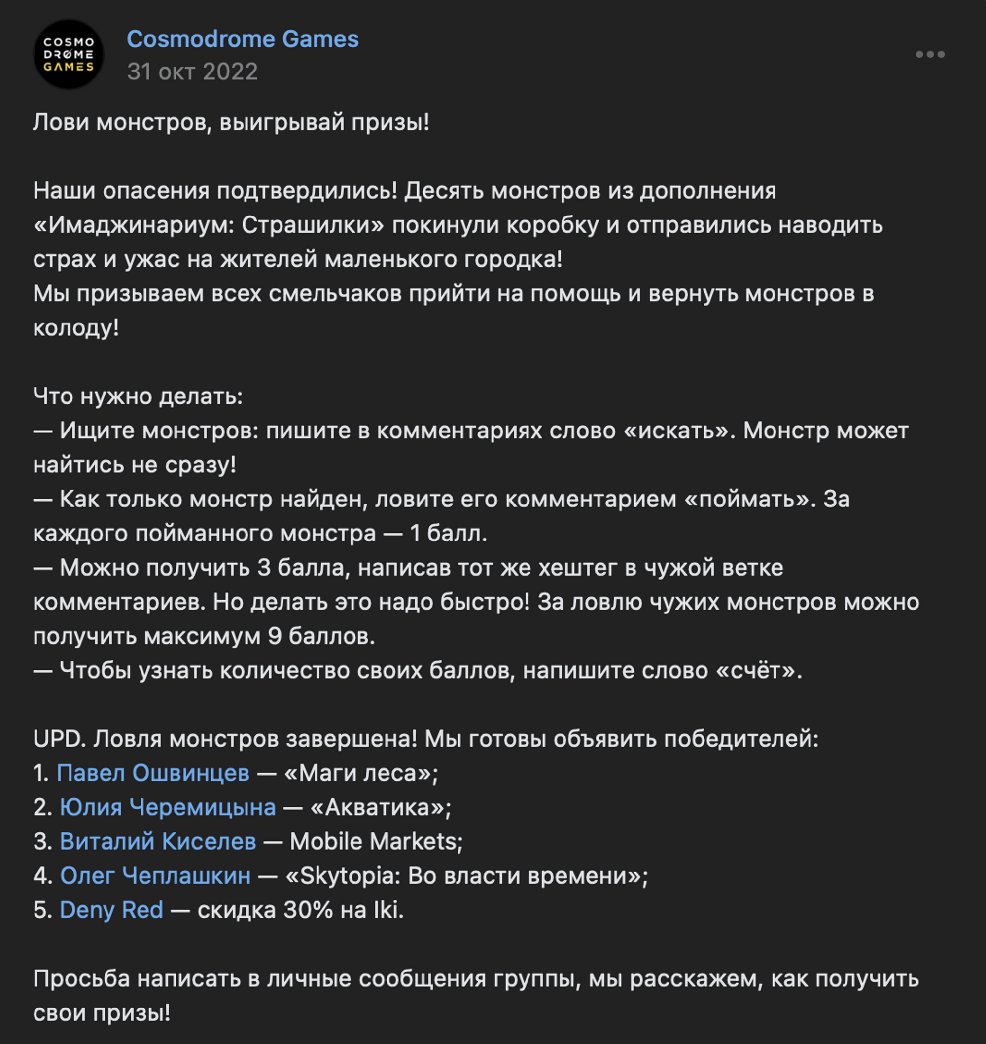 и быстро поднять статистику. Например, повысить охват, увеличить ER или промотировать продукт. Cosmodrome Games производит настольные игры, поэтому для них это ещё и тематически отличный вариант.